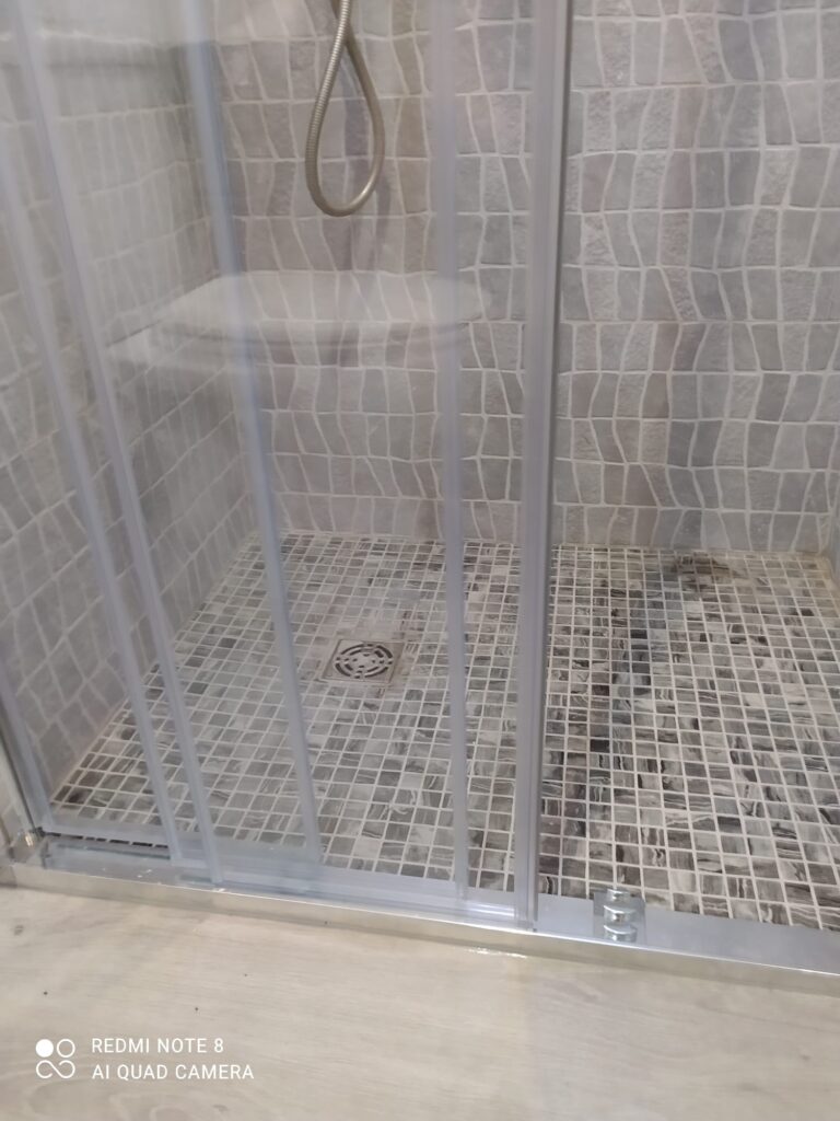 Fotos con el móvil de bañera sustituida por este plato de ducha, donde dominan los colores grises en el baño original.