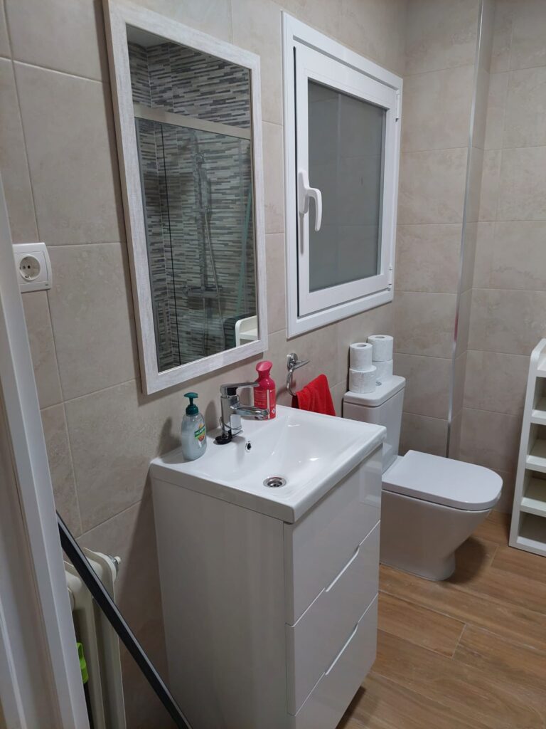En ambos baños se ha colocado, sobre la plaqueta antigua existente, un suelo de tarima vinílica rígida de 7 mm de espesor, modelo Anapurna, en gris claro. Resistente a arañazos y sobre todo a la humedad. Ideal para baños y cocinas, con una excelente imitación a madera.