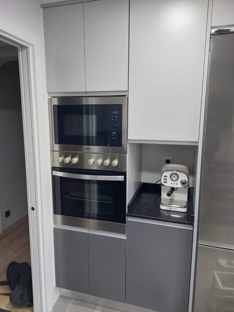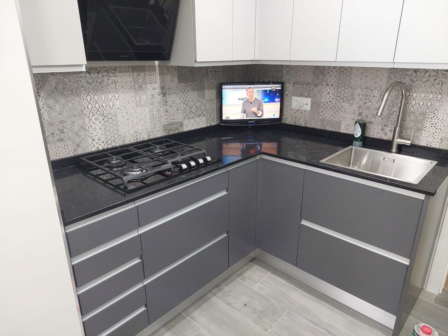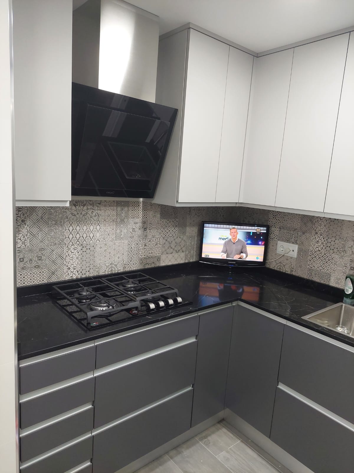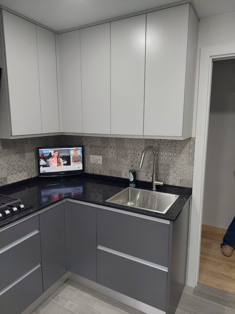 Muebles de cocina modelos Folkeston y stom en dos tonos distintos arriba y abajo, gris claro y marengo. Encimera modelo Portoro de Compac. Moderna, funcional y preciosa.