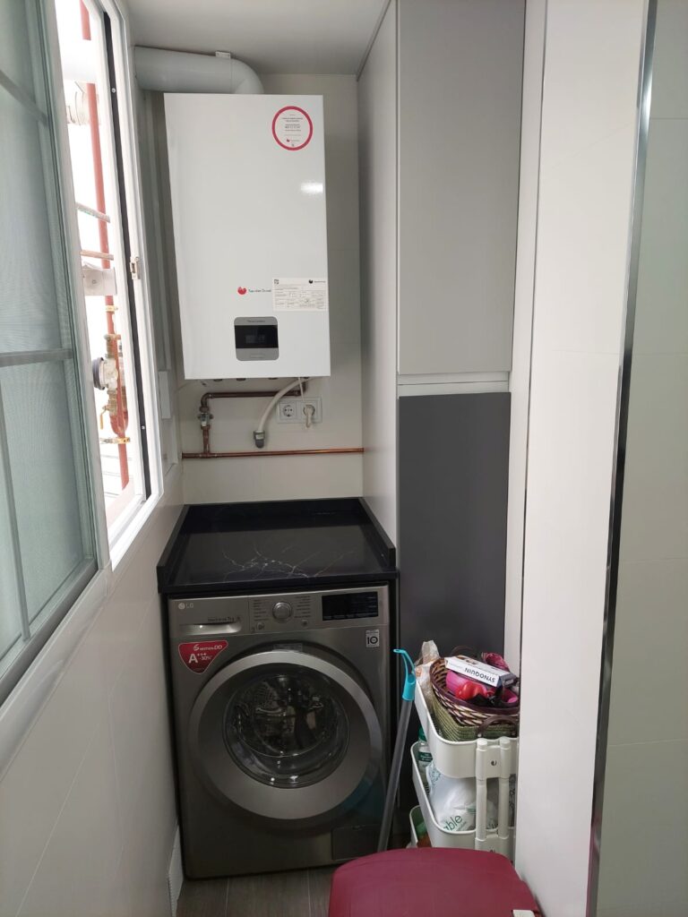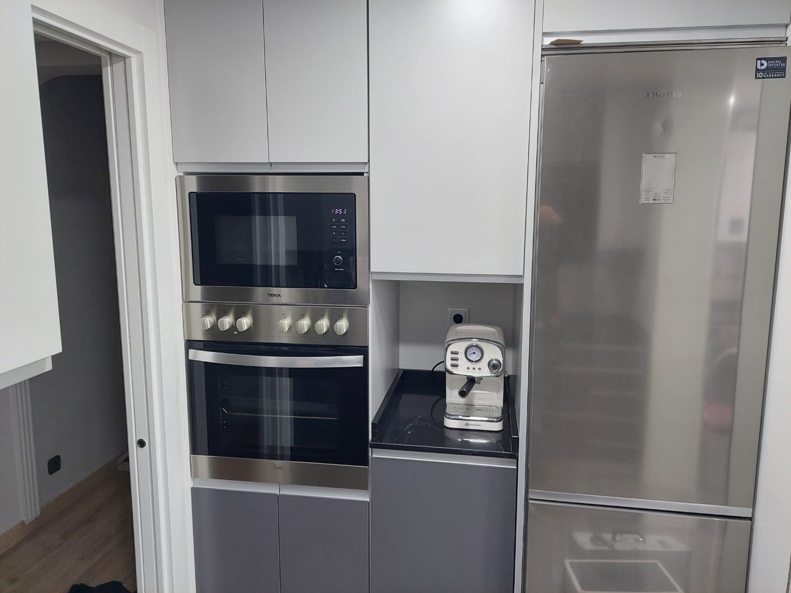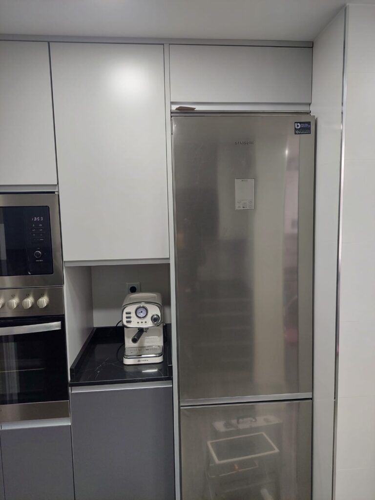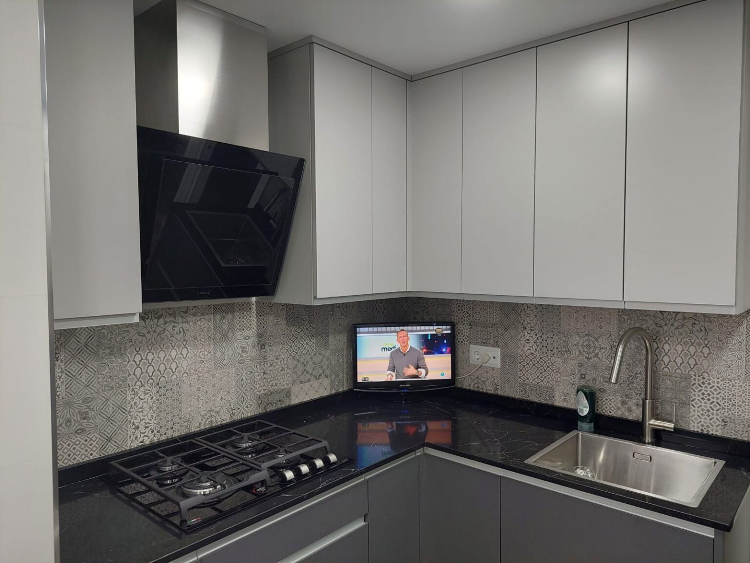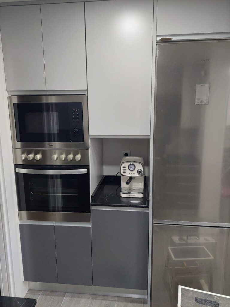 Muebles de cocina modelos Folkeston y stom en dos tonos distintos arriba y abajo, gris claro y marengo. Encimera modelo Portoro de Compac. Moderna, funcional y preciosa.